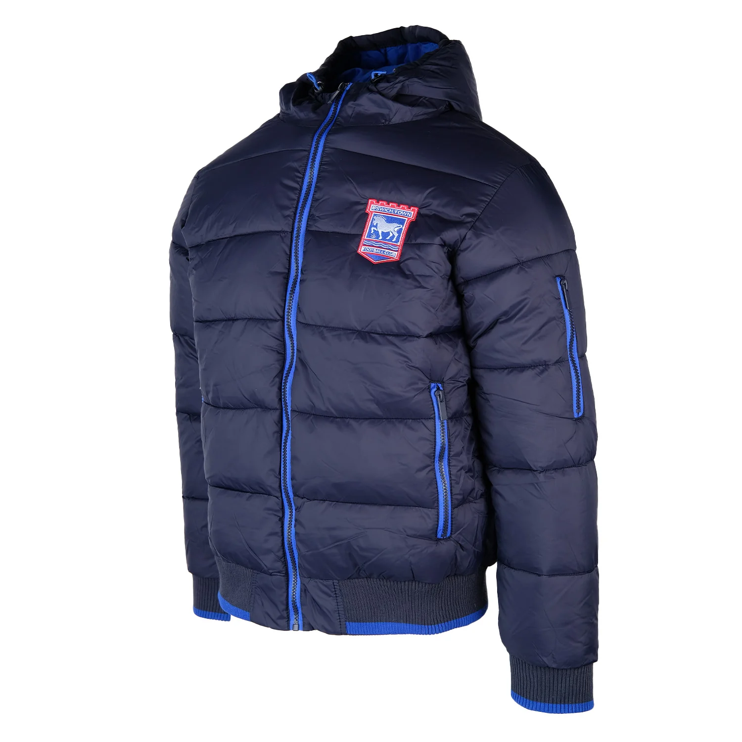 Navy padded jacket with full zip fastening, and blue contrast trim. Full colour embroidered club crest, and side zip pockets